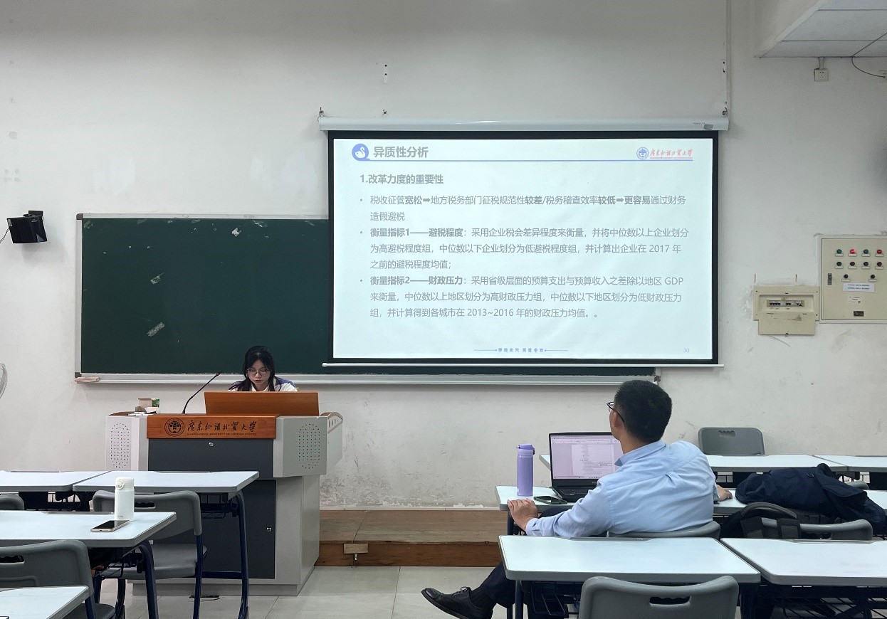 首先由李学轩同学介绍文章的制度背景和研究假说,在梳理税收征管体制改革的基础上,剖析了国地税合并如何影响企业信息披露行为。接着丘珊同学展示了研究设计和实证检验结果,着重解释了核心变量的构造。随后李齐笑同学汇报了稳健性检验部分。最后,吴芷婷同学阐述了进一步讨论部分,并对结论、政策建议和研究局限性做了简要概括。