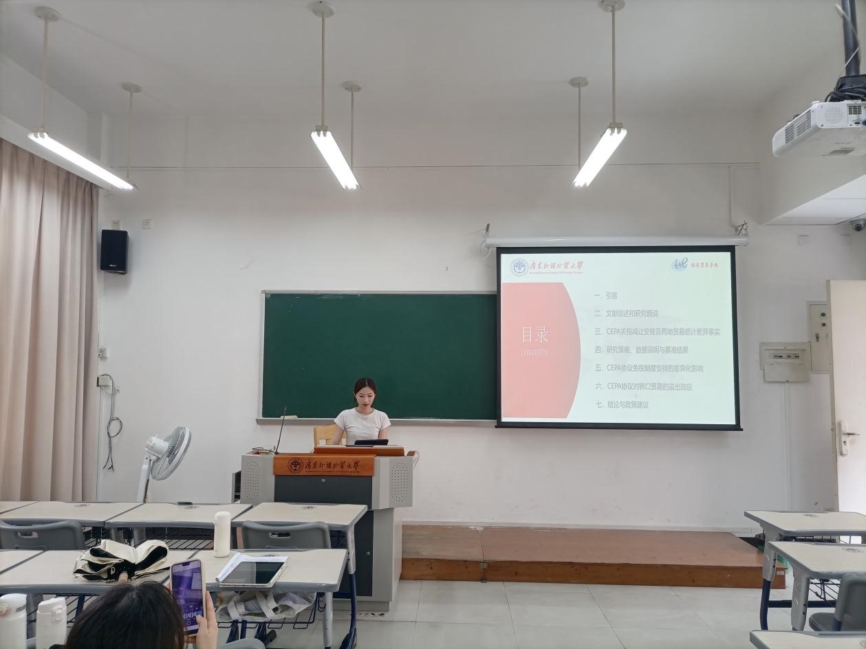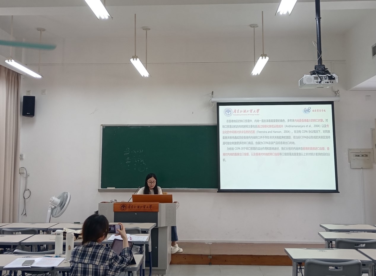 2024年4月11日下午14点00分,2024年第5期(总期第75期)经贸学院国贸学术论坛于教学楼B座308室举行。经贸学院郭晴老师受邀担任本次论坛主持人,23级硕士研究生洪湘仪、熊凤妍、周训和邓晓敏组队汇报田曦和王学君学者发表于《世界经济》2023年第10期的文章《收之桑榆,失之东隅:区域贸易协定下的进口逃税》。学院各级研究生同学积极参与本次文献研讨会议。