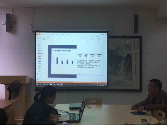 经济组由两位同学进行汇报,2016级研究生刘剑平,汇报题目是《广东省出口企业“生产率悖论”的检验--基于集聚效应的角度》;2017级研究生张蔼容同学,汇报题目为《广东农民收入影响因素研究》。两位同学分别从现实角度论述了选题的意义,并认真听取了康老师、安老师和李老师给予的指导意见,并就实证研究问题与两位老师积极交流,与会师生就各种问题进行了良好互动。